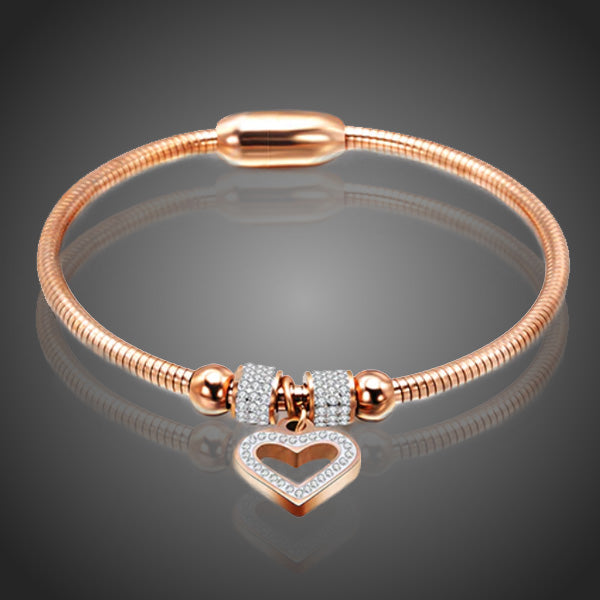 Milý dámsky náramok z chirurgickej ocele vo farbe ružového zlata s padavým srdiečkom doplnený čírymi krištáľmi . Uzatváranie na magnet. Zachováva si dlhotrvajúci lesk a jas. Antialergické.