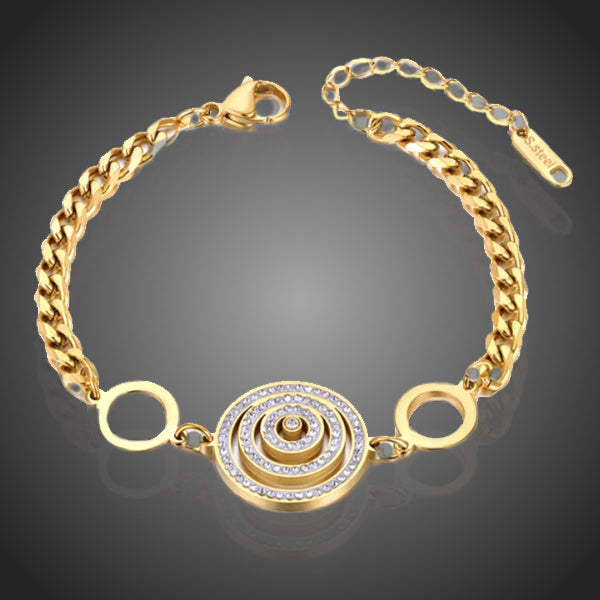 Zaujímavý dámsky náramok s medajlónom vykladaný čírymi krištáľmi na stane Vašim moderným doplnkom. Zachováva si dlhotrvajúci lesk a jas. Antialergické.