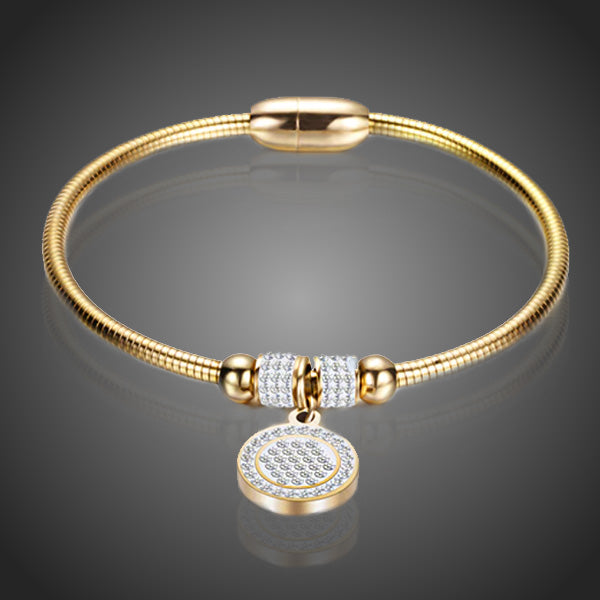 Elegantný dámsky náramok z chirurgickej ocele vo farbe žltého zlata s padavým medajlónikom a drobnými čírymi krištáľmi na ruke zažiari. Uzatváranie na magnet. Zachováva si dlhotrvajúci lesk a jas. Antialergické.