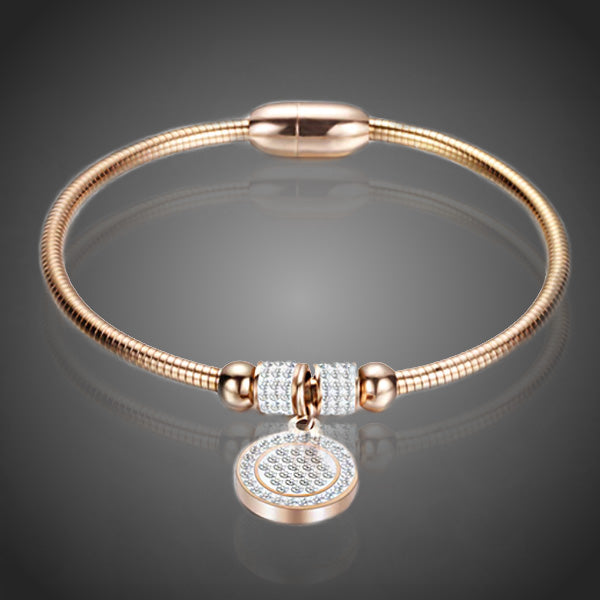 Zaujímavý dámsky náramok z chirurgickej ocele vo farbách ružového zlata s padavým medajlónikom a drobnými čírymi krištáľmi na ruke zažiari. Uzatváranie na magnet. Zachováva si dlhotrvajúci lesk a jas. Antialergické.