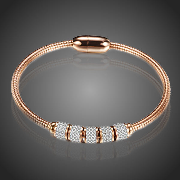 Elegantný dámsky náramok z chirurgickej ocele vo farbe ružového zlata s efektnými čírymi krištáľmi na ruke zažiari . Uzatváranie na magnet. Zachováva si dlhotrvajúci lesk a jas. Antialergické.