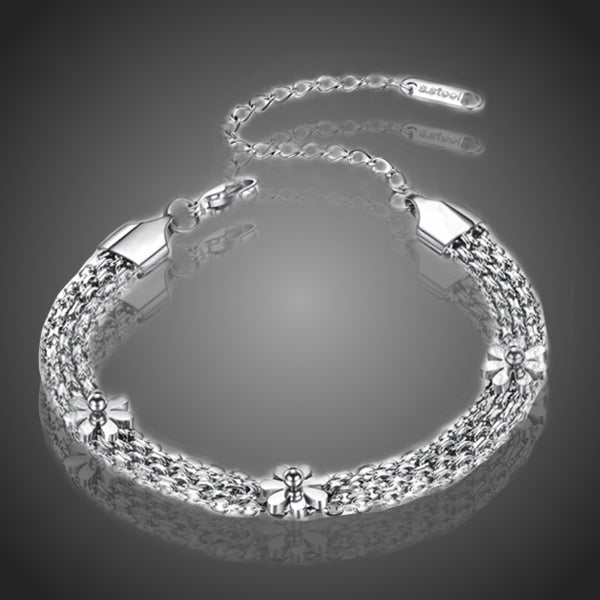 Milý vrstvený náramok z chirurgickej ocele vo farbe bieleho zlata s kvietkami. Zachováva si dlhotrvajúci lesk a jas. Antialergické.