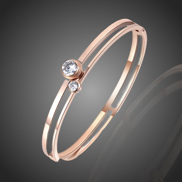 Krásny jemný dámsky náramok z chirurgickej ocele v ružovom zlate vykladaný dvoma čírymi krištáľmi sa stane milým doplnkom. Zachováva si dlhotrvajúci lesk a jas. Antialergické.