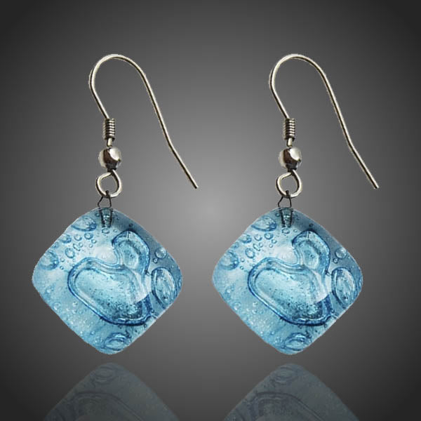 Nádherné originálne visiace náušnice v tyrkysovom prevedení s unikátnym bublinkovým dizajnom odolného skla v tvare kosoštvorca. Antialergické. Vhodný na bežné nosenie aj na spoločenské udalosti.