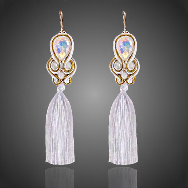 Módny hit. Ručne šité biele náušnice soutache technikou s krištáľom a strapcami. Antialergické. V reále sú nádherné.