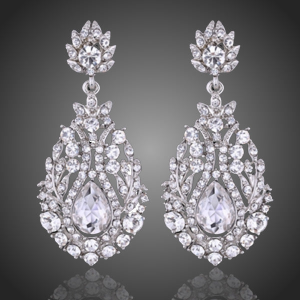 Krásne spoločenské visiace náušnice s mnohými čírymi krištáľmi na Vás zažiaria. Vhodné aj ako svadobné náušnice.