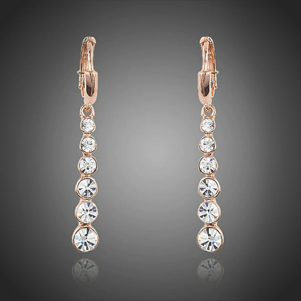 Dlhé pozlátené dámske náušnice s čírymi krištáľmi. Zachováva si dlhotrvajúci lesk a jas. Bez obsahu niklu, olova, kadmia. Antialergické.