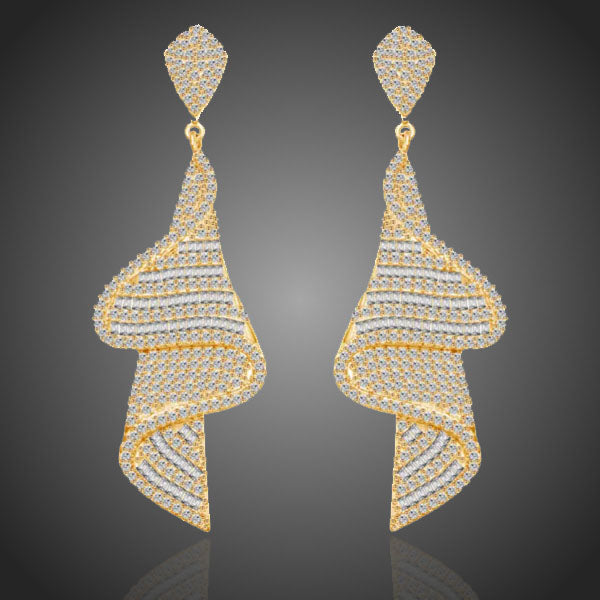 Visiace dámske luxusné náušnice v žiari stoviek čírych zirkónov v tvare nádherného vodopádu vyzdvihnú Váš celkový outfit. Vhodné ako spoločenské, či svadobné náušnice. Vďaka galvanizácii 3 vrstvou žltého zlata si zachovávavjú dlhotrvajúci lesk a jas. Bez obsahu niklu, olova, kadmia. Antialergické.