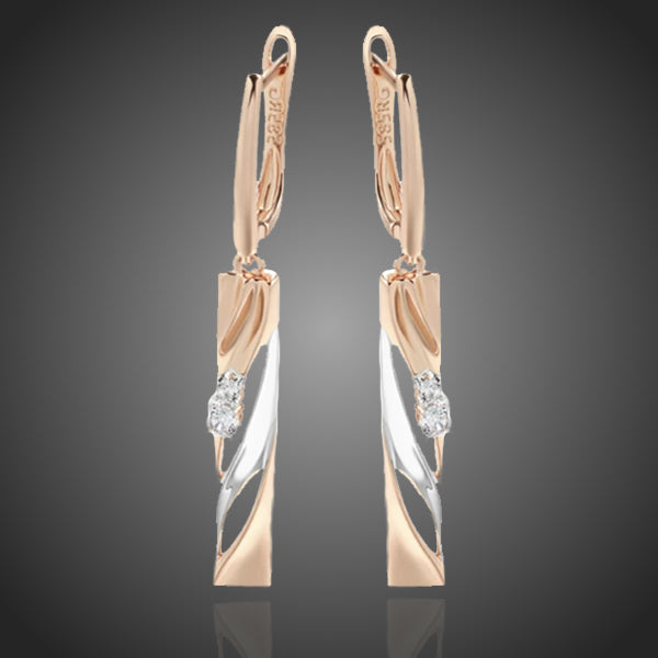 Krásne ladné visiace náušnice kombinované s bielym a ružovým zlatom obohatené žiarivým zirkónom. Vďaka kvalitnej galvanizácii si zachováva dlhotrvajúci lesk a jas. Bez obsahu niklu, olova, kadmia. Antialergické.