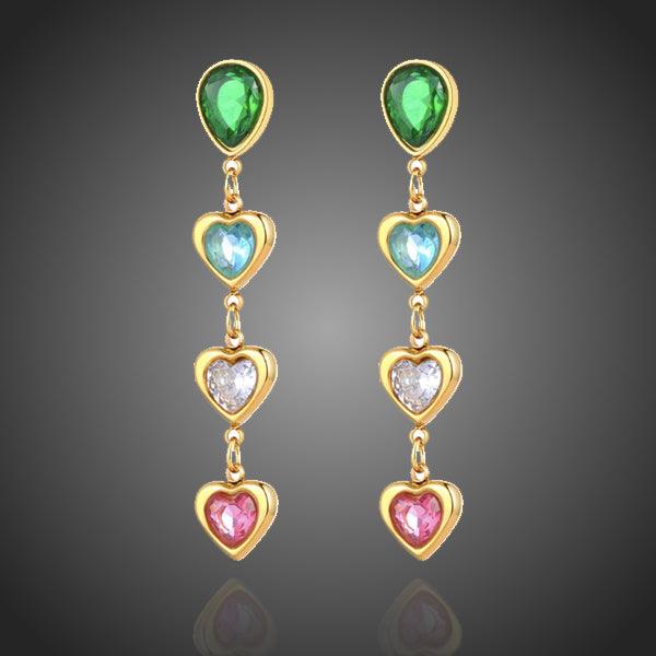 Ladné dlhé visiace náušnice so srdiečkami vykladané farebnými zirkónmi na ušku zažiaria. Zachováva si dlhotrvajúci lesk a jas. Antialergické.