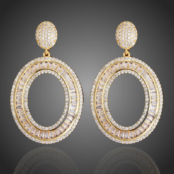 Visiace dámske náušnice v žiari stoviek čírych zirkónov v jemných kruhoch sa stanú krásnym doplnkom. Zachováva si dlhotrvajúci lesk a jas. Bez obsahu niklu, olova, kadmia. Antialergické.