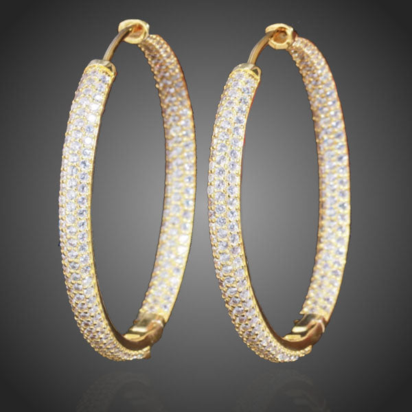 Obľúbené kruhové náušnice vykladané stovkami žiarivých čírych zirkónov s diamantovým odleskom pomocou špeciálnej techniky micropave. Vďaka galvanizácii 3 vrstvou žltého zlata si dlhotrvajúci lesk a jas. Bez obsahu niklu, olova, kadmia. Antialergické.