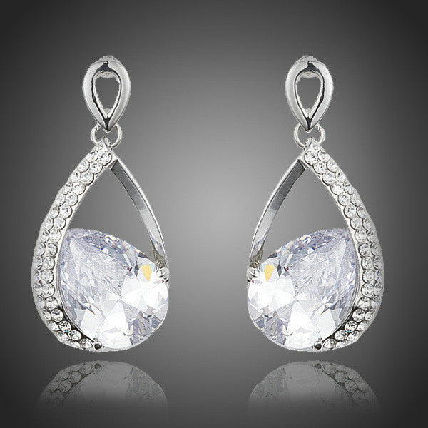 Dizajnové visiace náušnice v tvare kvapky s výrazným čírym zirkónom doplnené drobnými zirkónmi Vás rozžiaria.