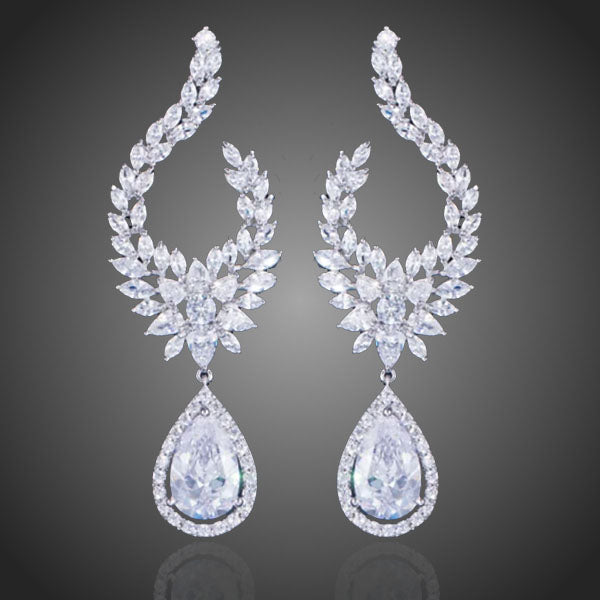 Visiace dámske luxusné náušnice v žiari stoviek čírych v ladnom zaujímavom tvare sa stanú krásnym doplnkom. Vhodné ako spoločenské, či svadobné náušnice. Vďaka galvanizácii 3 vrstvou bieleho zlata si zachovávajú dlhotrvajúci lesk a jas. Bez obsahu niklu, olova, kadmia. Antialergické.