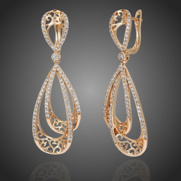 Krásne dámske visiace náušnice s prepracovaným dizajnom v ladných kvapkách s čírymi zirkónmi. Vďaka kvalitnej galvanizácii si zachováva dlhotrvajúci lesk a jas. Bez obsahu niklu, olova, kadmia. Antialergické.