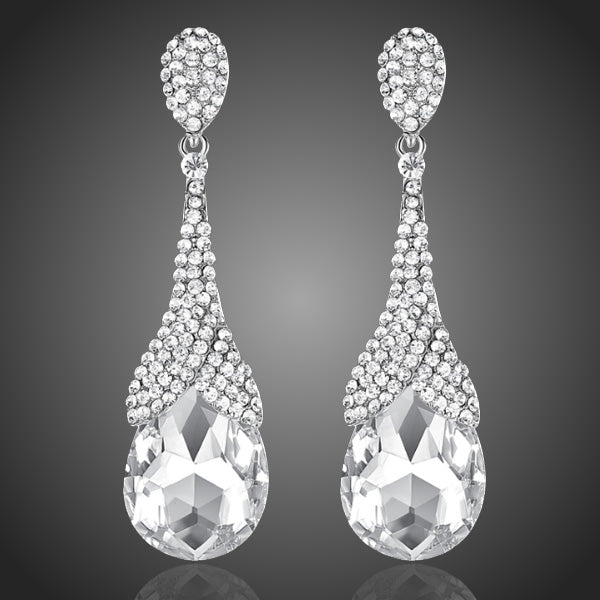 Krásne spoločenské visiace náušnice v štíhlych kvapkách vykladané mnohými čírymi krištáľmi. Vhodné aj ako svadobné náušnice.