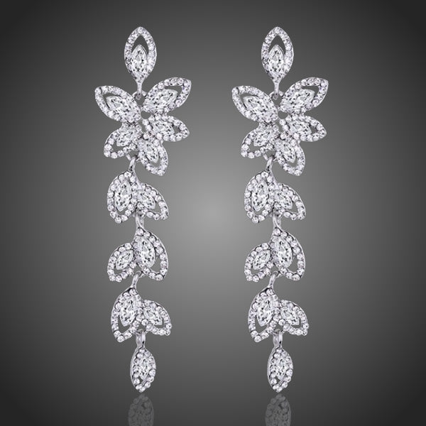 Nádherné spoločenské visiace náušnice s mnohými čírymi krištáľmi v kvetoch. Vhodné aj ako svadobné náušnice. Vhodné ako spoločenské, či svadobné náušnice. Vďaka galvanizácii 3 vrstvou bieleho zlata si zachovávavjú dlhotrvajúci lesk a jas. Bez obsahu niklu, olova, kadmia. Antialergické.