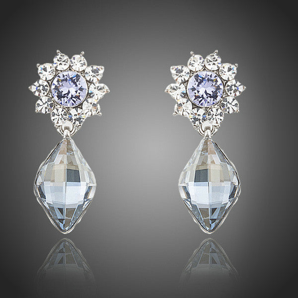 Elegantné náušnice s drobnými čírymi zirkónmi v kvete doplnené krištáľom v tvare kvapky. Zachovávajú si dlhotrvajúci lesk a jas.