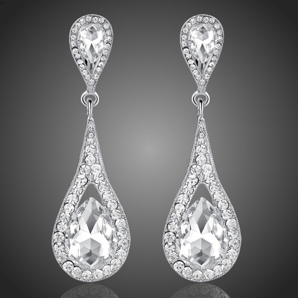Žiarivé spoločenské visiace náušnice v ladných kvapkách s čírymi krištáľmi. Vhodné aj ako svadobné náušnice.