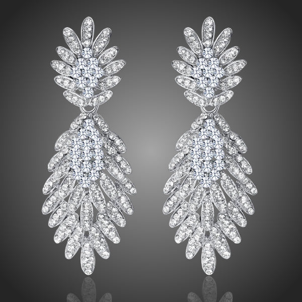 Žiarivé spoločenské visiace náušnice v lístkoch s čírymi krištáľmi. Vhodné aj ako svadobné náušnice.