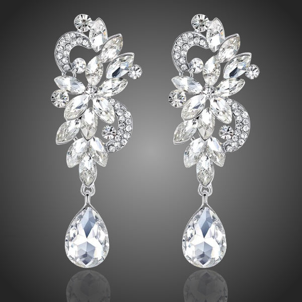 Nádherné spoločenské visiace náušnice s čírymi krištáľmi doplnené kvetom. Vhodné aj ako svadobné náušnice.