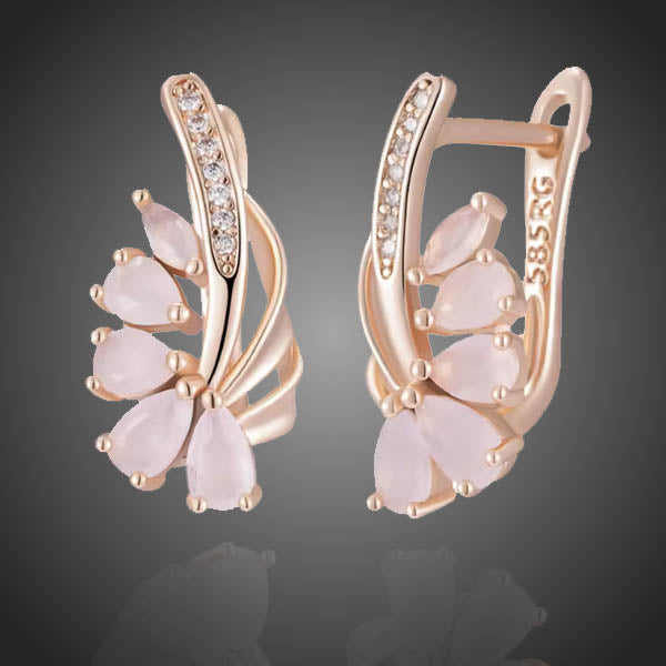 Krásne romantické ružové náušnice s kvetmi vykladané modným ružovým opálom a čírymi zirkónmi. Vďaka kvalitnej galvanizácii si zachováva dlhotrvajúci lesk a jas. Bez obsahu niklu, olova, kadmia. Antialergické.