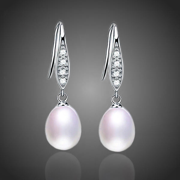 Elegantné visiace náušnice s bielymi riečnymi perlami doplnené čírymi zirkónmi. Vďaka galvanizácii platinou si zachováva dlhotrvajúci lesk a jas. Bez obsahu niklu, olova, kadmia. Antialergické.