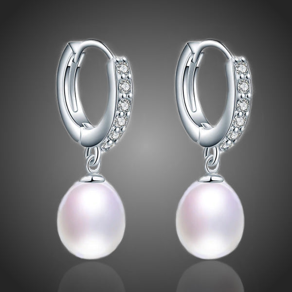 Elegantné visiace náušnice s bielymi riečnymi perlami doplnené čírymi zirkónmi. Vďaka galvanizácii platinou si zachováva dlhotrvajúci lesk a jas. Bez obsahu niklu, olova, kadmia. Antialergické.
