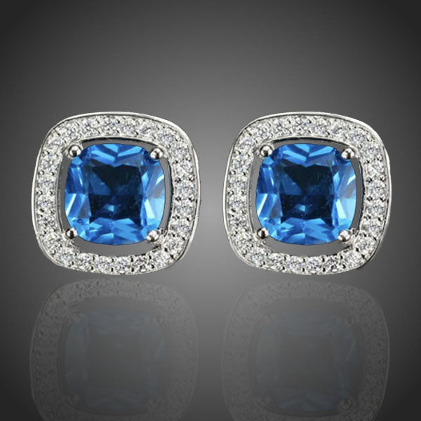 Krásne dámske klasické kockové náušnice s modrým zirkónom obkolesený čirymi zirkónmi na bežný deň aj do spoločnosti. Zachováva si dlhotrvajúci lesk a jas. Bez obsahu niklu, olova, kadmia. Antialergické.