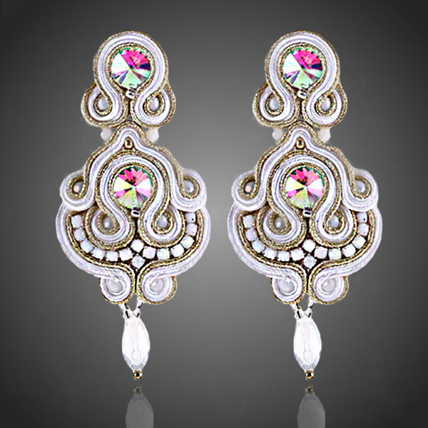Módny hit. Čarovné ručne šité dlhé biele náušnice soutache technikou s čírymi a dúhovými krištáľmi. Antialergické.