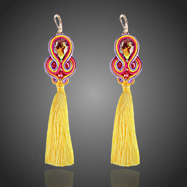 Módny hit. Ručne šité žlté náušnice soutache technikou s krištáľom a strapcami. Antialergické. V reále sú nádherné.