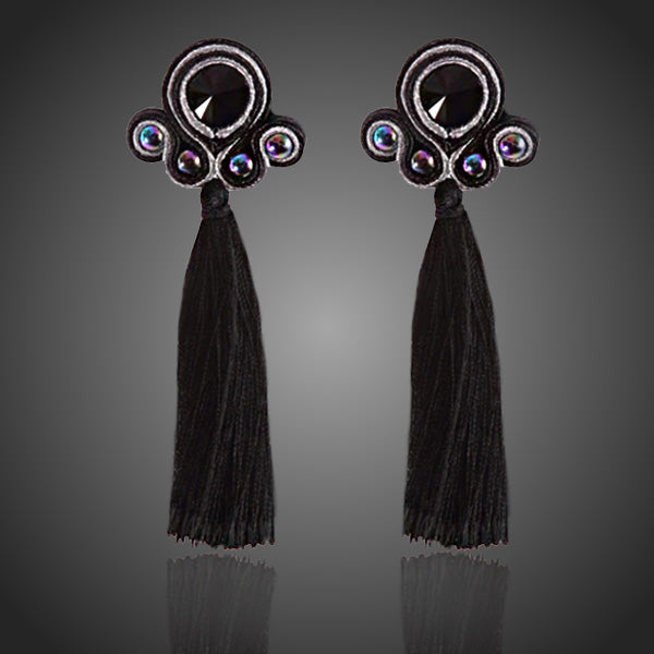 Módny hit. Ručne šité čierne náušnice soutache technikou s čiernym krištáľom a strapcami. Antialergické. V reále sú nádherné.