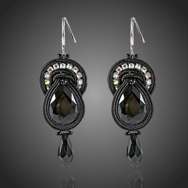 Módny hit. Visiace ručne šité čierne náušnice soutache technikou s čiernými a čírymi krištáľmi. Antialergické.
