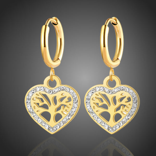 Krásne ladné visiace srdcové náušnice vykladané čírymi krištáľmi na uškách zažiaria. Zachováva si dlhotrvajúci lesk a jas. Antialergické.