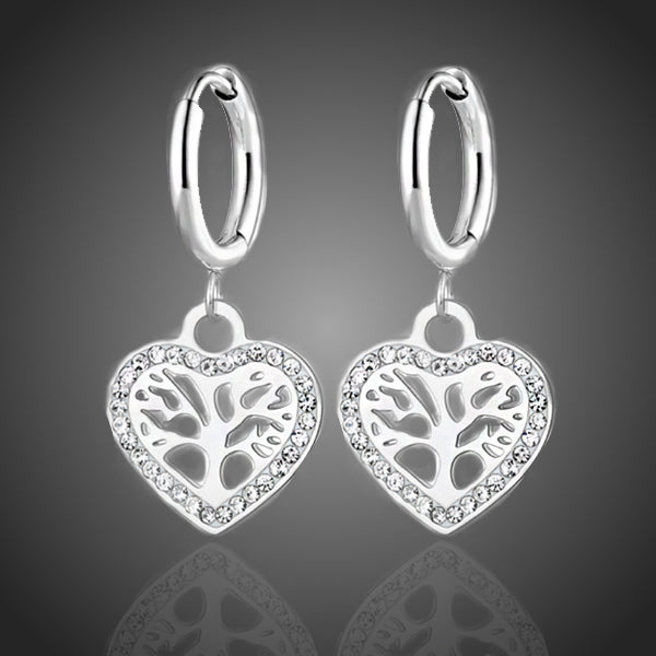 Krásne ladné visiace srdcové náušnice vykladané čírymi krištáľmi na uškách zažiaria. Zachováva si dlhotrvajúci lesk a jas. Antialergické.