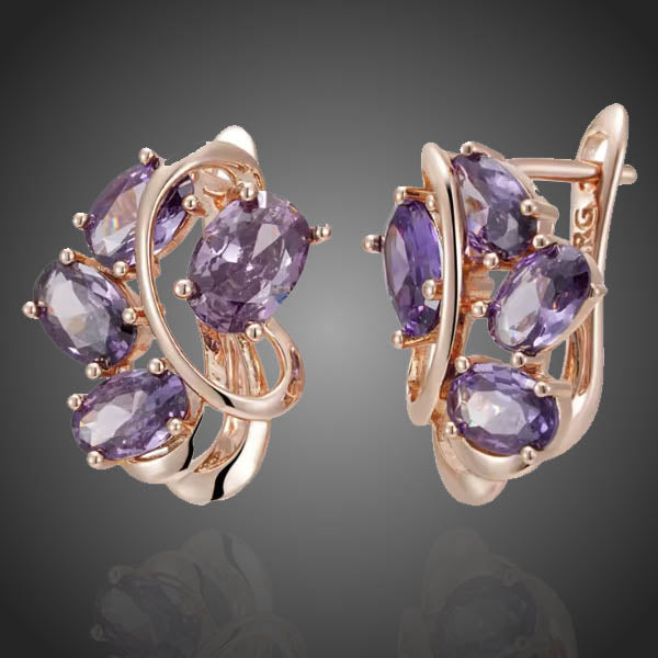 Krásne točené náušnice s fialovými zirkónmi v kvetoch v kombinácii s ružovým zlatom znežnia Vašu tvár.Vďaka kvalitnej galvanizácii si zachováva dlhotrvajúci lesk a jas. Bez obsahu niklu, olova, kadmia. Antialergické.