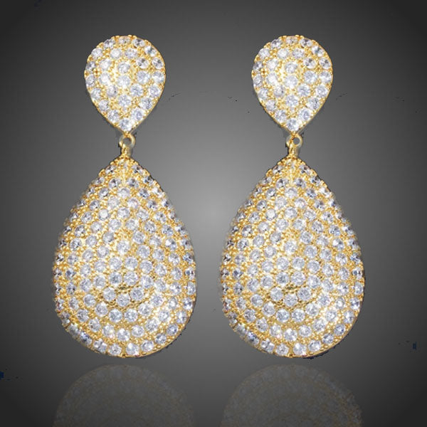 Visiace dámske náušnice v žiari stoviek čírych zirkónov v ladných kvapkách vyzdvihnú Váš celkový outfit. Vhodné ako spoločenské, či svadobné náušnice. Vďaka galvanizácii 3 vrstvou žltého zlata si zachovávavjú dlhotrvajúci lesk a jas. Zachováva si dlhotrvajúci lesk a jas. Bez obsahu niklu, olova, kadmia. Antialergické.