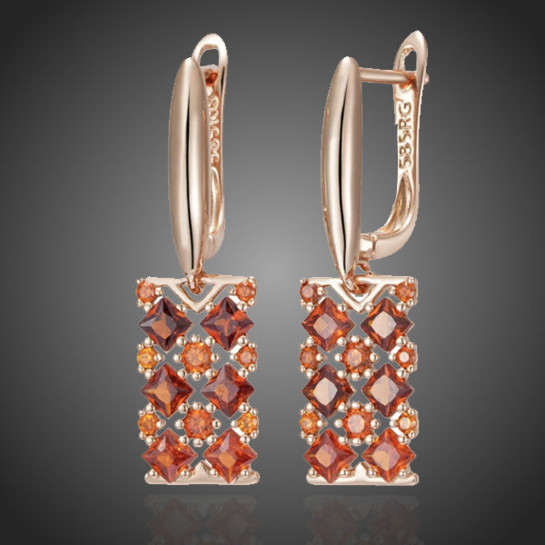 Ladné visiace náušnice s obdĺžníkmi vykladané žiarivými červený zirkónmi na ušku zaujmú. Vďaka kvalitnej galvanizácii si zachováva dlhotrvajúci lesk a jas. Bez obsahu niklu, olova, kadmia. Antialergické.