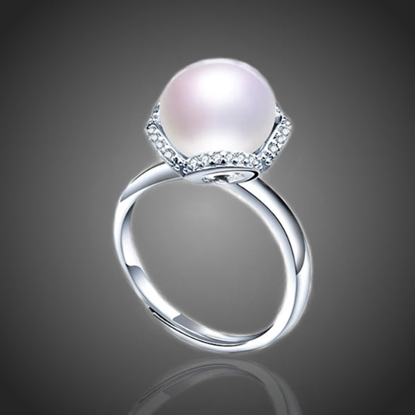 Krásny prsteň s bielou riečnou perlou a drobnými čírymi zirkónmi. Vďaka galvanizácii platinou si zachováva dlhotrvajúci lesk a jas. Bez obsahu niklu, olova, kadmia. Antialergické. Prsteň má jednu univerzálnu nadstaviteľnú veľkosť.