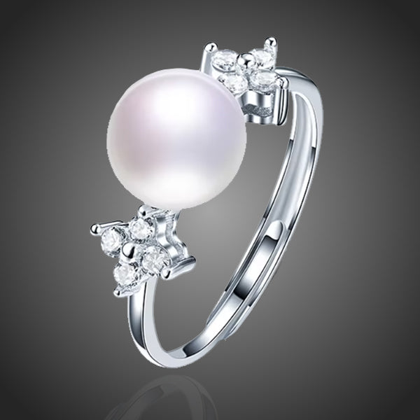 Elegantný prsteň s bielou riečnou perlou s čírymi zirkónmi v drobných kvietkoch. Vďaka galvanizácii platinou si zachováva dlhotrvajúci lesk a jas. Antialergické. Prsteň má jednu univerzálnu nadstaviteľnú veľkosť.