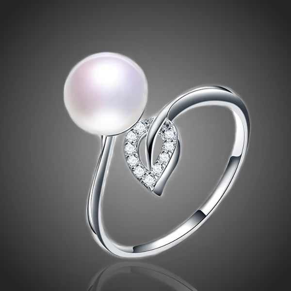 Jemný prsteň s bielou riečnou perlou doplnený zirkónovým lístkom. Vďaka galvanizácii platinou si zachováva dlhotrvajúci lesk a jas. Prsteň má jednu univerzálnu nadstaviteľnú veľkosť. Bez obsahu niklu, olova, kadmia. Antialergické.