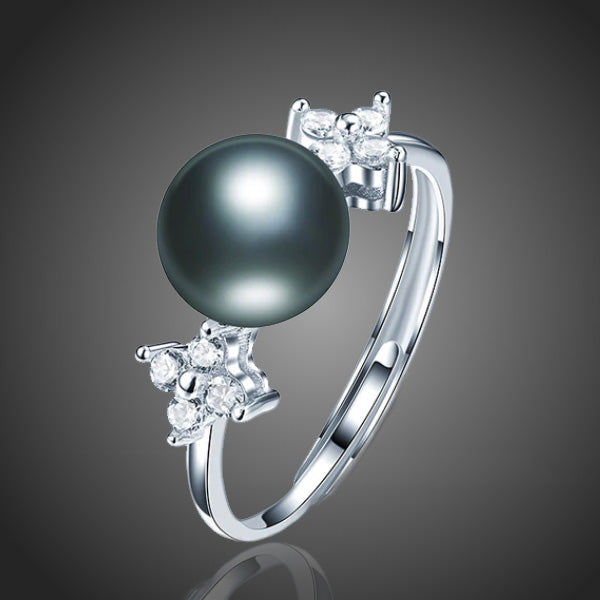 Elegantný prsteň s čiernou riečnou perlou s čírymi zirkónmi v drobných kvietkoch. Vďaka galvanizácii platinou si zachováva dlhotrvajúci lesk a jas. Antialergické. Prsteň má jednu univerzálnu nadstaviteľnú veľkosť.