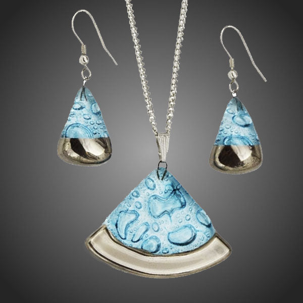 Nádherný originálny set v modrom prevedení s unikátnym bublinkovým dizajnom modrého odolného skla zdobeného pravou platinou. Antialergické. Vhodný na bežné nosenie aj na spoločenské udalosti.