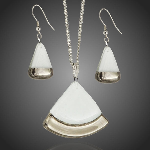 Nádherný originálny set s originálnym dizajnom maľovaného bieleho odolného skla zdobeného pravou platinou. Antialergické. Vhodný na bežné nosenie aj na spoločenské udalosti.