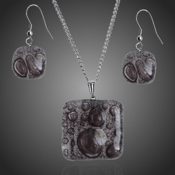 Nádherný originálny set s unikátnym bublinkovým dizajnom hnedého maľovaného odolného skla. Antialergické. Vhodný na bežné nosenie aj na spoločenské udalosti.