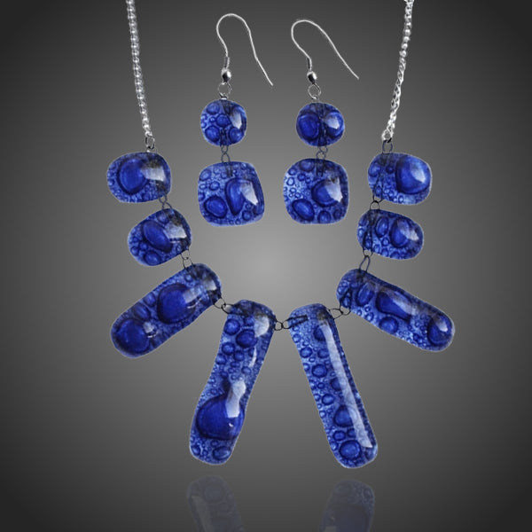 Nádherný originálny set v modrom prevedení s unikátnym bublinkovým dizajnom odolného skla v zaujímavom ladnom tvare. Antialergické. Vhodný na bežné nosenie aj na spoločenské udalosti.