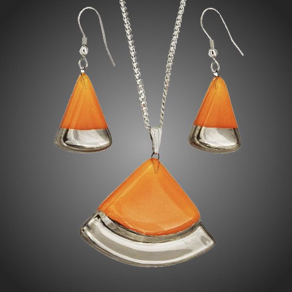 Nádherný originálny set v oranžovom prevedení s dizajnom maľovaného odolného skla zdobeného pravou platinou. Antialergické. Vhodný na bežné nosenie aj na spoločenské udalosti.