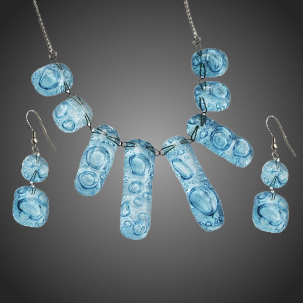 Nádherný originálny set v tyrkysovom prevedení s unikátnym bublinkovým dizajnom odolného skla v zaujímavom ladnom tvare. Antialergické. Vhodný na bežné nosenie aj na spoločenské udalosti.