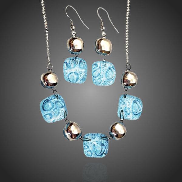 Nádherný originálny set v tyrkysom prevedení s unikátnym bublinkovým dizajnom odolného skla sv ladných koskcáh zdobený pravou platinou. Antialergické. Vhodný na bežné nosenie aj na spoločenské udalosti.