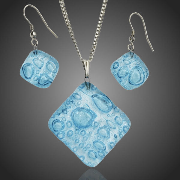 Nádherný set v tyrkysovom prevedení s unikátnym bublinkovým dizajnom skla. Antialergické. Vhodný na bežné nosenie aj na spoločenské udalosti.